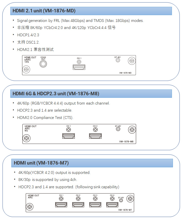 - 最多4個的接口插槽模塊,可選擇HDMI 2.1,12G-SDI, HDMI2.0b 3G 或 6G, DisplayPort 1.2a, V-by-One、模擬等多種接口模塊